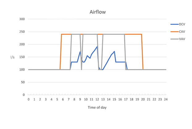 A hagyományos szellőztetőrendszerek állandó légmennyiséget biztosítanak a helyiségnek, függetlenül attól, hogy az éppen használatban van-e vagy sem. Az ilyen rendszert CAV-nak (Constant Air Volume) nevezik (narancssárga vonal a diagramon). A fejlettebb szellőztető rendszerek napközben változó térfogatárammal rendelkezhetnek, ezeket VAV-nak (Variable Air Volume) nevezik. Ez egy előre meghatározott program vagy mozgásérzékelők alapján csökkenti és növeli a légmennyiséget aszerint, hogy az épületet általában mikor használják (szürke vonal az ábrán).