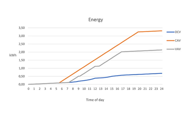 Példánkban egy 200 négyzetméteres iroda energiafelhasználását számoltuk ki, ahol a nap folyamán emberek jönnek és mennek. A tényleges megtakarítás épületenként és helyiségenként eltérő, de az ábra jó képet ad arról, hogy valójában mekkora hatása van az egyes szellőztetési típusoknak. Példánkban a CAV-rendszer által felhasznált energia ötször nagyobb, mint a DCV-rendszer által felhasznált energia.