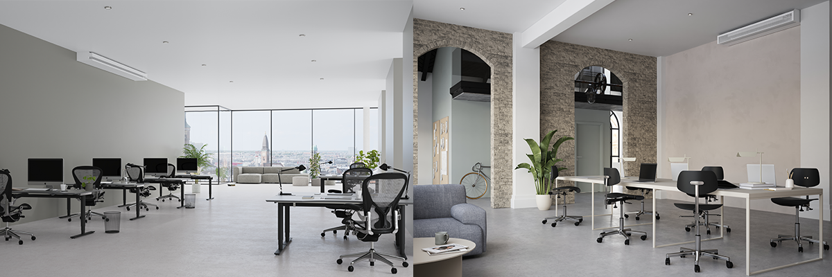 A Plafond XD rugalmas elhelyezési lehetőségeket kínál, teljes mértékben az adott helyiség építészeti és műszaki adottságaihoz igazítható. Felszerelhető a mennyezetre, a mennyezethez közel a falhoz rögzítve, a szoba közepére, vagy a megfelelő számú gerendával akár faltól falig terjedő burkolattal. Az optimális szellőzés és komfort már az esztétikai szempontok sérülése nélkül is megvalósítható.