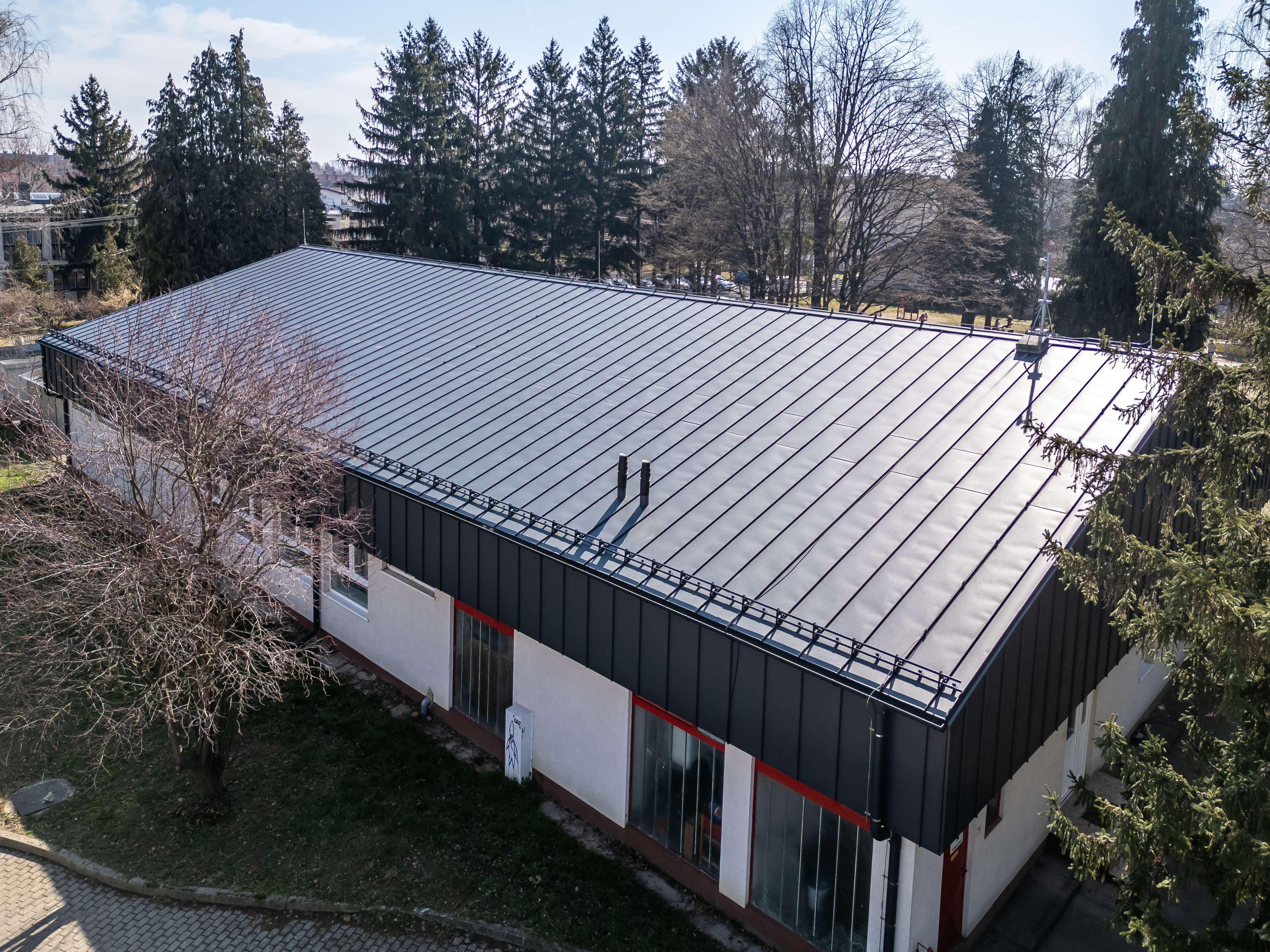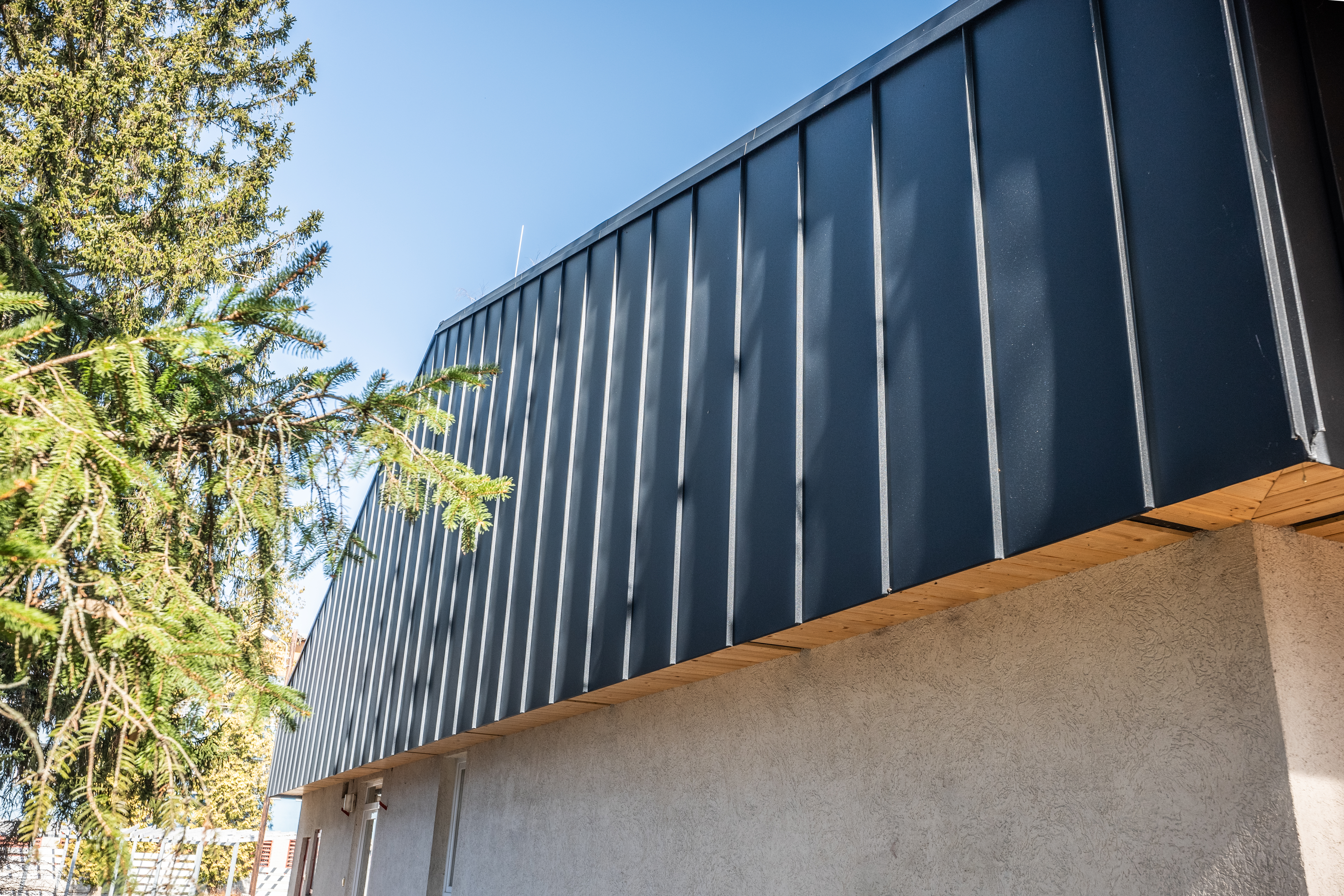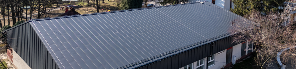 A projekt nemcsak a tető, hanem a homlokzat korszerűsítésére is kiterjedt. Classic matt bevonattal ellátott FOP-CO síklemezeket alkalmaztak, amelyek modern, letisztult arculatot kölcsönöznek az épületnek, miközben hozzájárulnak annak időtállóságához.