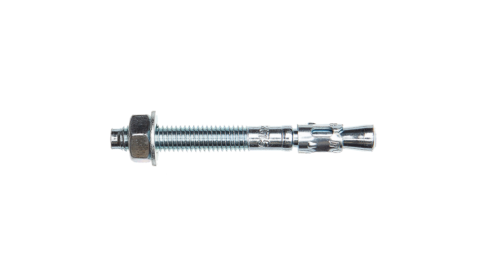 Single expander for assembly of details in concrete and natural stone. This is a so-called pin screw expander that has a stainless steel clip at the bottom. When the nut is tightened, the clip expands onto the tapered part of the expander. The top is equipped with a punching neck to avoid damage to the threads during impact. Galvanized carbon steel min 5μm. Strength 5.8.